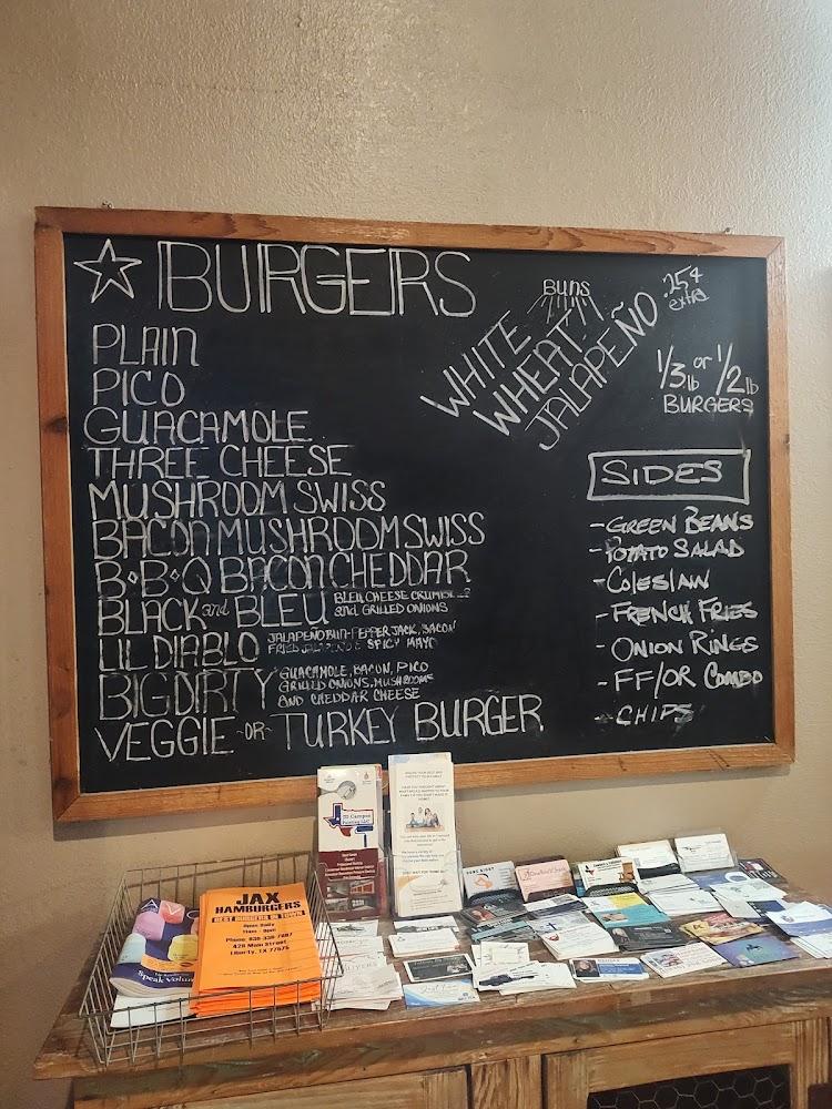 Welcome to Jax Hamburgers, the ultimate burger destination in Liberty, TX! Situated at 428 Main St, our restaurant offers a delicious selection of American classics featuring a variety of local specialties. Enjoy a relaxed atmosphere perfect for families, groups, or solo diners. We pride ourselves on our fast service and extensive drink menu, including craft beers and assorted teas. With options for dine-in, takeout, and delivery, we cater to all your meal needs. Accessibility is a priority, as we provide wheelchair-friendly seating and facilities. Visit us today for a satisfying meal that hits the spot!